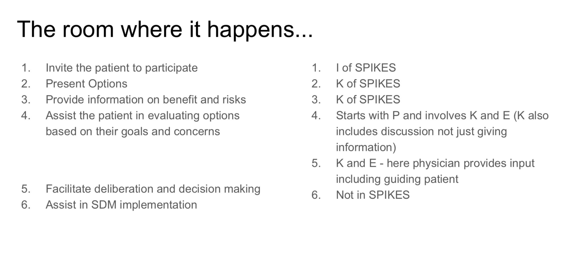 Setting up the conversation and Assessing perceptions or the “SP” of SPIKES are done before we walk into the room and start the shared decision-making process. We can use the patient’s framework and language during this process to ensure we communicate clearly.